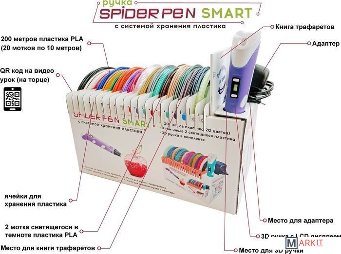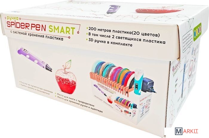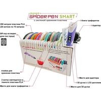 Комплектация 3D ручка Spider Pen PLUS;Книга трафаретов;20 цветов пластика PLA (в том числе 2 светящихся в темноте);Адаптер питания;Русифицированная и красочная упаковка;Инструкция.