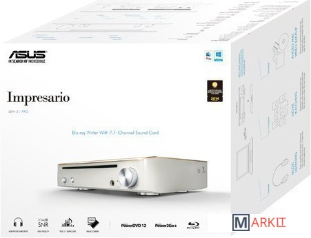ASUS Impresario SBW-S1 PRO имеет возможность чтения и записи практически всех форматов дисков CD, DVD и Blu-ray. Кроме того, устройство оснащено звуковой картой с аудиопроцессором C-Media 6631A и флагманским двухканальным ЦАП Cirrus Logic CS4398 с динамическим диапазоном 120 дБ. Также Impresario SBW-S1 PRO обустроен рядом аудиоинтерфейсов, позволяющих подключать различными способами многоканальную акустику.