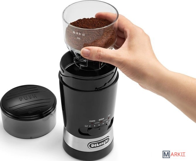 Съемный контейнер для кофейных зеренИмпульсная кнопка в крышкеКрышка на петляхЩетка для очисткиРазмеры: 223x111x111 ммВес: 1 кг
