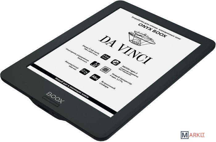ONYX BOOX DA VINCI — доступный ридер в компактном корпусе, оборудованный шестидюймовым экраном E Ink Carta с сенсорным управлением и подсветкой с возможностью регулировки цветовой температуры. Предустановленное программное обеспечение модели позволяет открывать большинство популярных книжных форматов без какой-либо дополнительной конвертации. Помимо этого, можно настраивать большинство параметров внешнего вида текста: шрифт, его размер, межстрочное расстояние, поля и многое другое. Модель не имеет встроенных беспроводных модулей и поэтому может использоваться в тех ситуациях, когда их наличие не желательно.