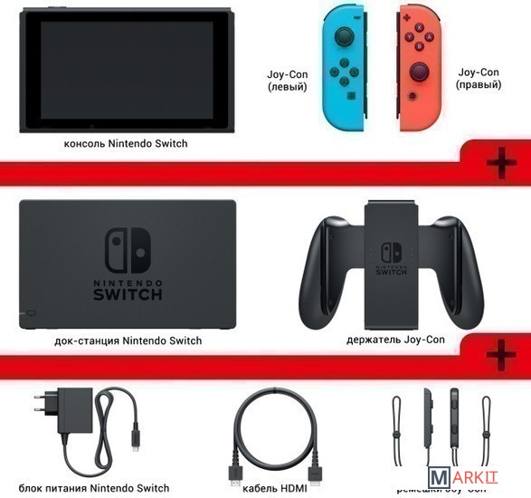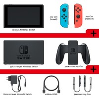 Полная комплектация • консоль Nintendo Switch;• Joy-Con (левый) и Joy-Con (правый);• док-станция Nintendo Switch;• держатель Joy-Con;• 2 ремешка для фиксации Joy-Con на руках;• HDMI-кабель;• блок питания.