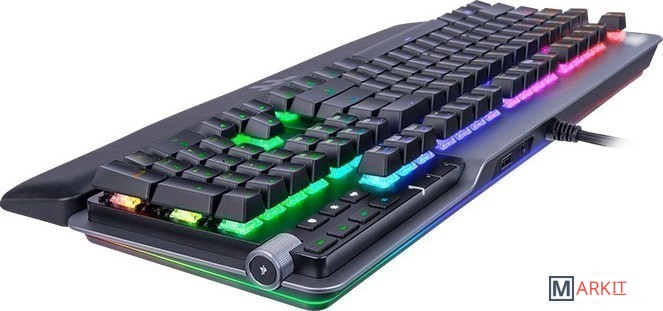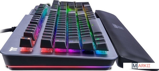 Игровая клавиатура с алюминиевым топкейсом и круговой RGB подсветкой в нижней части, создающей неповторимы ореол.