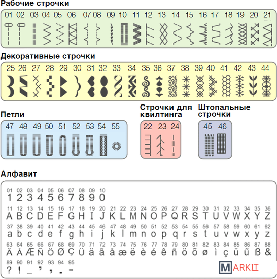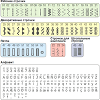 | Швейные операции | потайная строчка, трикотажная строчка, декоративная строчка, алфавит (латиница) |