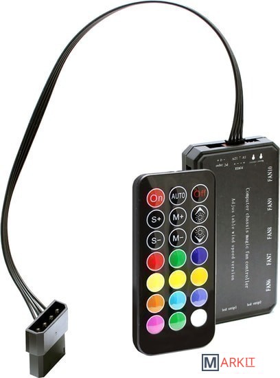 Контроллер управления RGB вентиляторами корпуса с ДУ пультом управления. Возможность подключения до 10 вентиляторов RGB и до двух линий RGB. Подключение к материнской плате для управления подсветкой с компьютера. До 200 встроенных различных режимов подсветки. Регулировка скорости вращения вентиляторов с пульта (3 режима).