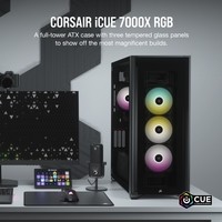 За тремя изготовленными из закаленного стекла панелями корпуса CORSAIR iCUE 7000X RGB формата Full-Tower ATX все компоненты вашей системы будут видны как на ладони: пространство для одновременной установки до трех 360-миллиметровых радиаторов, система скрытой прокладки кабелей и четыре входящих в комплект вентилятора CORSAIR SP140 RGB ELITE.Программное обеспечение CORSAIR iCUE объединяет все настройки, превращая вашу игровую станцию в цельную экосистему с эффектом полного погружения и интуитивно понятным управлением.Корпус iCUE 7000X RGB в сочетании с программным обеспечением CORSAIR iCUE является лучшим в своем классе интеллектуальным корпусом. Программное обеспечение iCUE позволяет легко настраивать RGB-подсветку и управлять скоростью вращения до шести вентиляторов.COMMANDER CORE XT — это больше, чем просто контроллер для управления подсветкой и скоростью вращения до шести вентиляторов. Его функционал можно расширить для мониторинга температуры (два температурных датчика входят в комплект поставки). Кроме того, контроллер COMMANDER CORE XT можно подключить к другим совместимым с iCUE устройствам, таким как полосы подсветки LS100 или комплекты расширения светодиодной RGB-подсветки Lighting PRO.Три прочные панели из закаленного стекла толщиной 4 мм обеспечивают обзор всех компонентов вашей системы.Акцентируйте внимание на своей графической карте с помощью инновационного вертикального крепления для графических карт, которое отличается оптимальным размером для установки самых мощных современных графических карт и обеспечивает достаточное пространство для беспрепятственного воздухообмена.Оснащенный окошком кожух блока питания с возможностью персонализации позволяет увидеть все компоненты системы изнутри. Снимите панель, добавьте виниловую графику, нанесите свой логотип лазером или установите подсветку, чтобы придать вашей системе индивидуальности.Быстро и легко уложите основные кабели в один просторный потайной канал глубиной 25 мм за материнской платой, предусмотренный для всех кабелей, которые легко скрыть за откидной стальной дверцей.