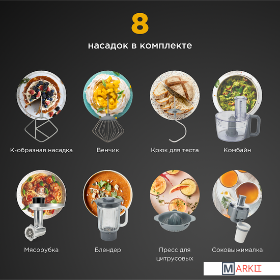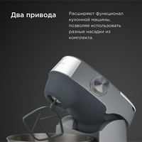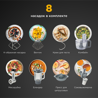 Функции мясорубка, блендер, соковыжималка, цитрус-пресс, взбивание, смешивание, замешивание дрожжевого теста, измельчитель, рубка, терка, шинковка, ломтерезка, драники