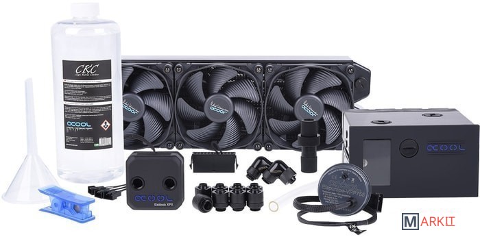 Жидкостное охлаждение с радиаторным блоком для внутреннего или наружного крепления с прозрачным хладагентом.• Радиатор медный NexXxoS XT45 360 мм;• Резервуар Eisfach;• Помпа Eispumpe VPP755;• Водоблок Eisblock XPX (Intel/AMD);• Вентиляторы Eiswind Silent Edition 120 мм (3 шт.);• Охлаждающая жидкость прозрачного цвета CKC Cape Kevin Catchher 1000 мл;• Фитинг (8 шт.);• Фитинг 90° (2 шт.);• Трубки 13/10 мм (3 м);• Воронка (1 шт.);• Инструмент для обрезки шлангов;• Кабели питания;