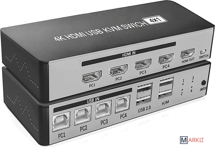 Четырех портовый KVM-переключатель 4K HDMI USB позволяет управлять четырьмя устройствами с выходами HDMI UBS (компьютер, ноутбук и т.п.) с помощью одного дисплея, клавиатуры и мыши. Переключать можно с кнопки на корпусе устройства или выносной кнопки, также возможно переключение с использованием горячих кнопок на клавиатуре. Дополнительные порты USB2.0 позволяют подключить принтер, сканер, флешку и т.п.Широкая совместимость KVM-переключателя позволяет автоматически идентифицировать и сочетать различные подключаемые устройства, такие как ПК, ноутбук, Apple TV, PS3/PS4, Xbox, Sony, Blu-Ray плеер, HD DVR, спутниковый ресивер, TV-box, проектор, аудио/видео приемники и большинство устройств с поддержкой HDMI.