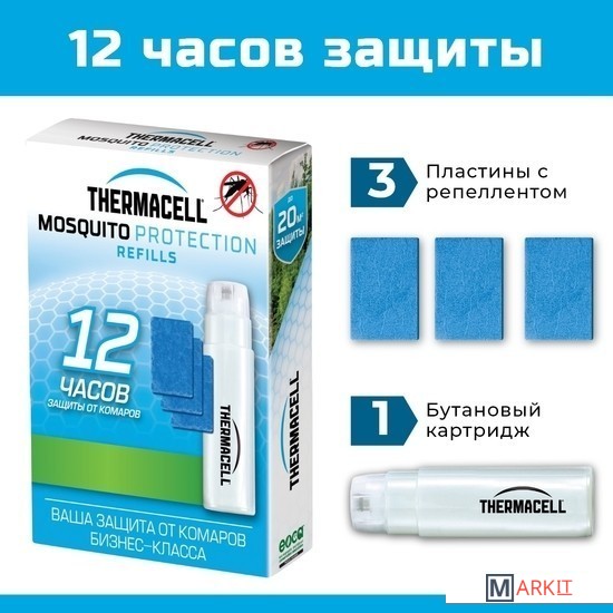 Запасной набор расходных материалов для приборов Thermacell — комплект из 3-х пластин и 1 газового картриджа. Этот набор иногда еще называют «сетом для новичков».Опытные пользователи значительно чаще покупают комплекты на 48 и 120 часов защиты. Выходит значительная экономия и денег и пропадает необходимость часто покупать расходники.Thermacell — идеальный выбор для охотников, рыболовов, дачников и любителей летнего вечернего и ночного отдыха на природе.Оригинальные заправки от комаров Thermacell эффективно отпугивают комаров, создавая зону защиты в 20 кв. м.Идеально подходит для использования со всеми противомоскитными приборами Thermacell во время туристических походов, охоты, рыбалки, пикников и вечеринок на природе, садоводства и во дворе на даче или в загородном доме.В комплект входит 3 пластины с репеллентом и 1 газовый картридж. Время суммарной защиты от комаров – 12 часов.Один газовый картридж, который нагревает пластину, рассчитан на 12 часов работы, а пластина с репеллентом рассчитана на 4 часа непрерывной защиты от комаров.Активным ингредиентом является аллетрин – синтетическая версия натурального репеллента, содержащегося в цветах хризантемы.Важно помнить: ресурс картриджей и пластинок не обязательно вырабатывать за один раз. Если нужно защиту от комаров «поставить на паузу», достаточно выключить прибор, вытащить пластинку и положить ее в сухое темное место.Эффективность и безопасность Thermacell высоко оценили специалисты американского агентства по охране окружающей среды (ЕРА).Не оставляйте комарам ни единого шанса!