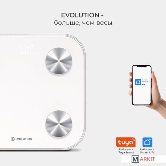 Умные весы EVOLUTION измеряют вес и проводят диагностику Вашего тела. Весы синхронизируются со смартфоном через Bluetooth и автоматически передают данные в приложение "Smart Life", которое совместимо IOS 8.0 и новее, Android 5.0 и новее.Приложение "Smart Life" на русском языке и интуитивно понятно. Для корректной оценки состояния тела в приложении нужно ввести возраст, пол и рост. Все данные носят справочный характер.Включаются и отключаются автоматически. Есть индикаторы низкого заряда и перегрузки. Прорезиненные ножки. Работают от батареек: 4 шт типа ААА, которые не входят в комплект.
