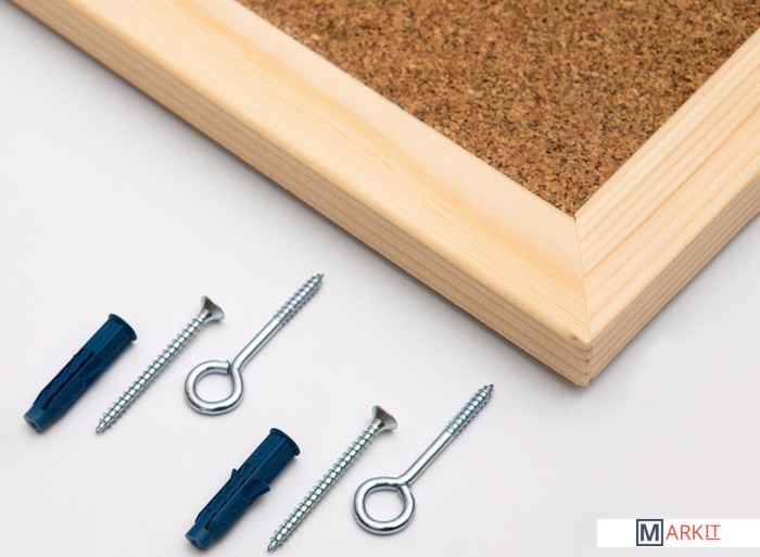 Пробковая доска в деревянной рамке. Поверхность доски из натуральной мелкозернистой пробки. Возможность прикрепления информации с помощью кнопок-гвоздиков и булавок. Рамка из натурального дерева. Скрытое крепление к стене в двух углах.