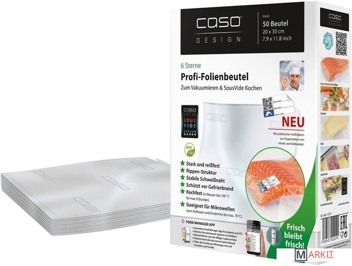Очень прочная и устойчивая к разрыву плёнка толщиной 160 мкмРифлёная структура пакета для создания вакуумаКрепкий и надёжный шовВ комплекте стикеры с QR-кодом для маркировкиВитамины и минералы сохраняются дольшеПлёнка без BPAЗащищает продукты от морозного ожога и потери ароматаМногоразовое использовании и мойка в ПММДопускается приготовление продуктов при 100°C максимум 4 часа и в СВЧ до 70°CИдеально подходит для Sous VideПодходит для всех бескамерных вакуумных упаковщиковИспользуйте приложение CASO FOOD MANAGER для сканирования стикеров с QR-кодом и маркируете пакеты с продуктами. Таким образом, у вас всегда будет четкое представление о том, что находится в вашем холодильнике или морозильной камере, а так же Вы получите оповещение на свой телефон об окончании срока годности.Составляйте список продуктов с возможностью сортировки по типу продуктов (рыба, мясо, овощи) или месту хранения (холодильник/морозильник/шкаф)