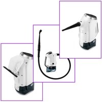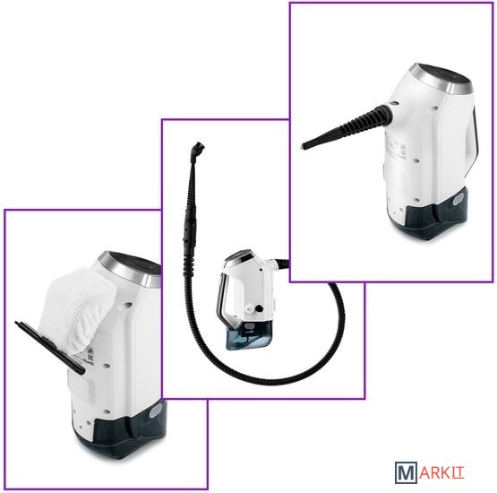 В комплекте с ручным пароочистителем идут: струйная насадка для уборки в труднодоступных местах; тряпка для отпаривания одежды и тканей; резиновый скребок для очистки окон и зеркал; 3 насадки-щётки для удалений стойких загрязнений, и гибкий шланг.