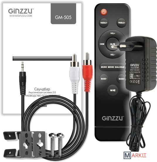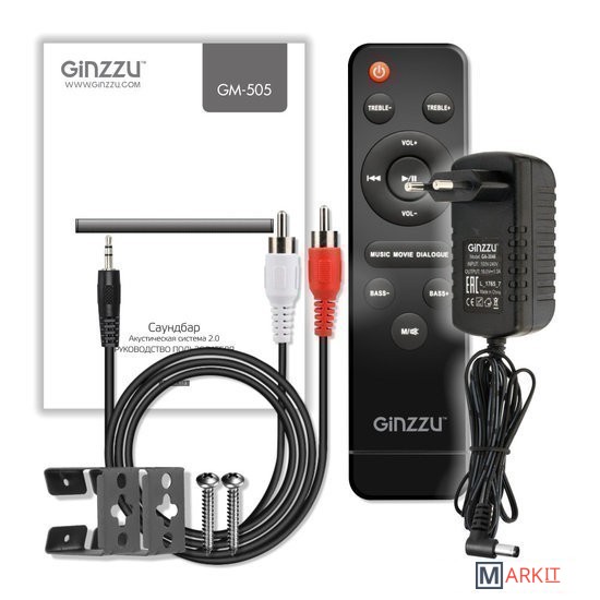 - пульт ДУ- адаптер питания- аудиокабель (3.5 мм - 2RCA)- набор для настенного крепежа- документация |