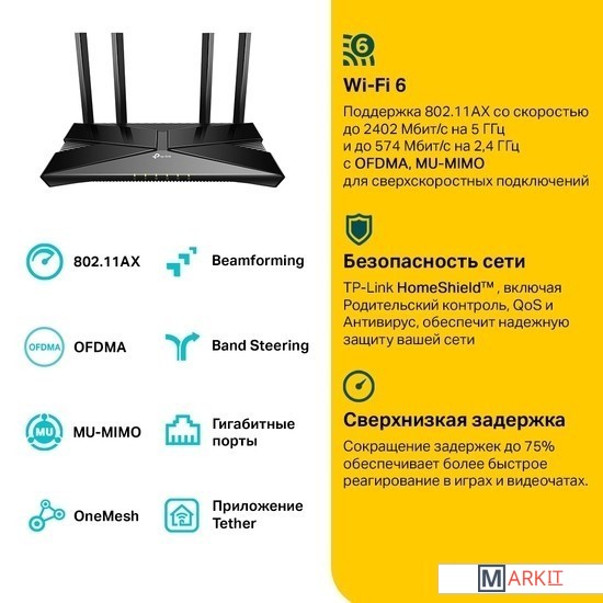 Гигабитный Wi-Fi 6 — скорость до 2402 Мбит/с на 5 ГГц и до 574 Мбит/с на 2,4 ГГц для более плавных потоковых видео и быстрых загрузок.Подключайте больше устройств — технологии MU-MIMO и OFDMA увеличивают производительность в 4 раза и позволяют подключать множество устройств одновременно.Ультранизкая задержка — ускоренный отклик во время онлайн-игр и видеозвонков.Расширенная зона покрытия Wi-Fi — четыре высокопроизводительные внешние антенны и технология Beamforming для более стабильного Wi-Fi во всём доме.TP-Link HomeShield — надёжная защита от кибератак.Бережёт аккумуляторы гаджетов — технология Target Wake Time позволяет устройствам больше взаимодействовать друг с другом, потребляя меньше питания.Поддержка OneMesh — используйте усилители OneMesh, чтобы создать покрытие во всём доме и не терять сигнал при перемещении.